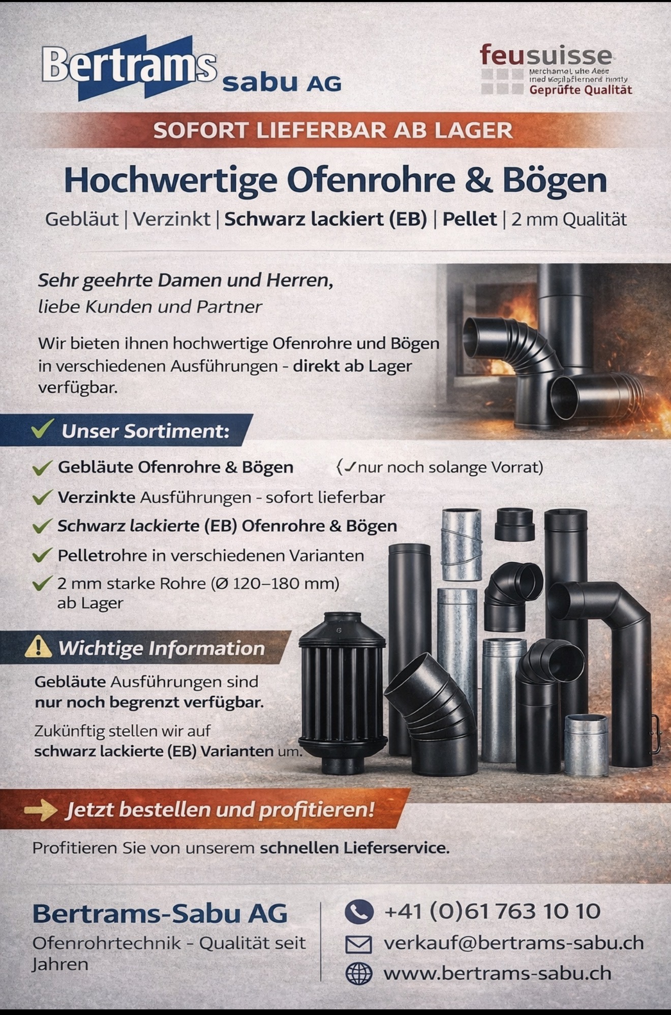 Willkommen bei Bertrams-Sabu AG – Ihrem zuverlässigen Partner für hochwertige Ofenrohre, Rauchrohre und Kaminzubehör in der Schweiz.